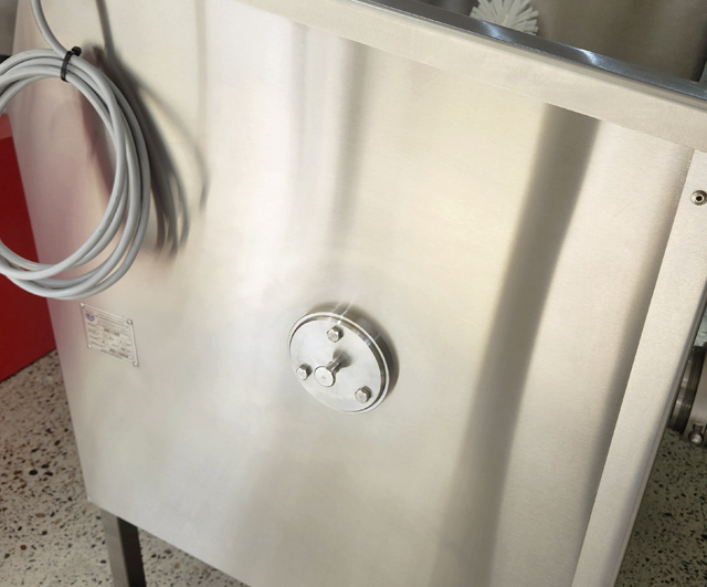 Robust and hygienic body. Strong side walls (tub ends) with 4 mm thick stainless steel. Polished stainless finish inside tub and exterior (not bead-blasted). Easily removable mixing paddle and mincing components. Easily moveable on 4 heavy duty stainless steel lockable swivel castors.