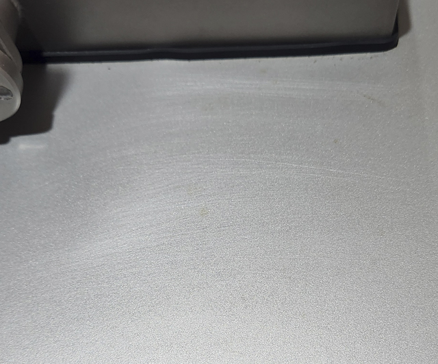 See photos for details of superficial deformities: (1) slight chemical damage to conveyor belt; (2) scour marks from cleaning; (3) slight scrapes inside bowl from removal and installation of of mixing arm.